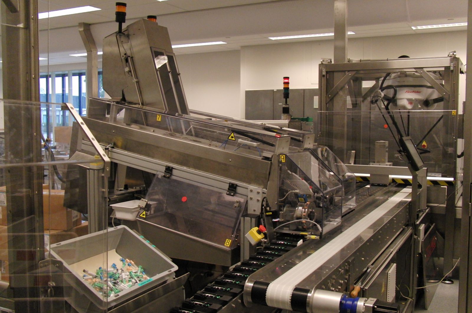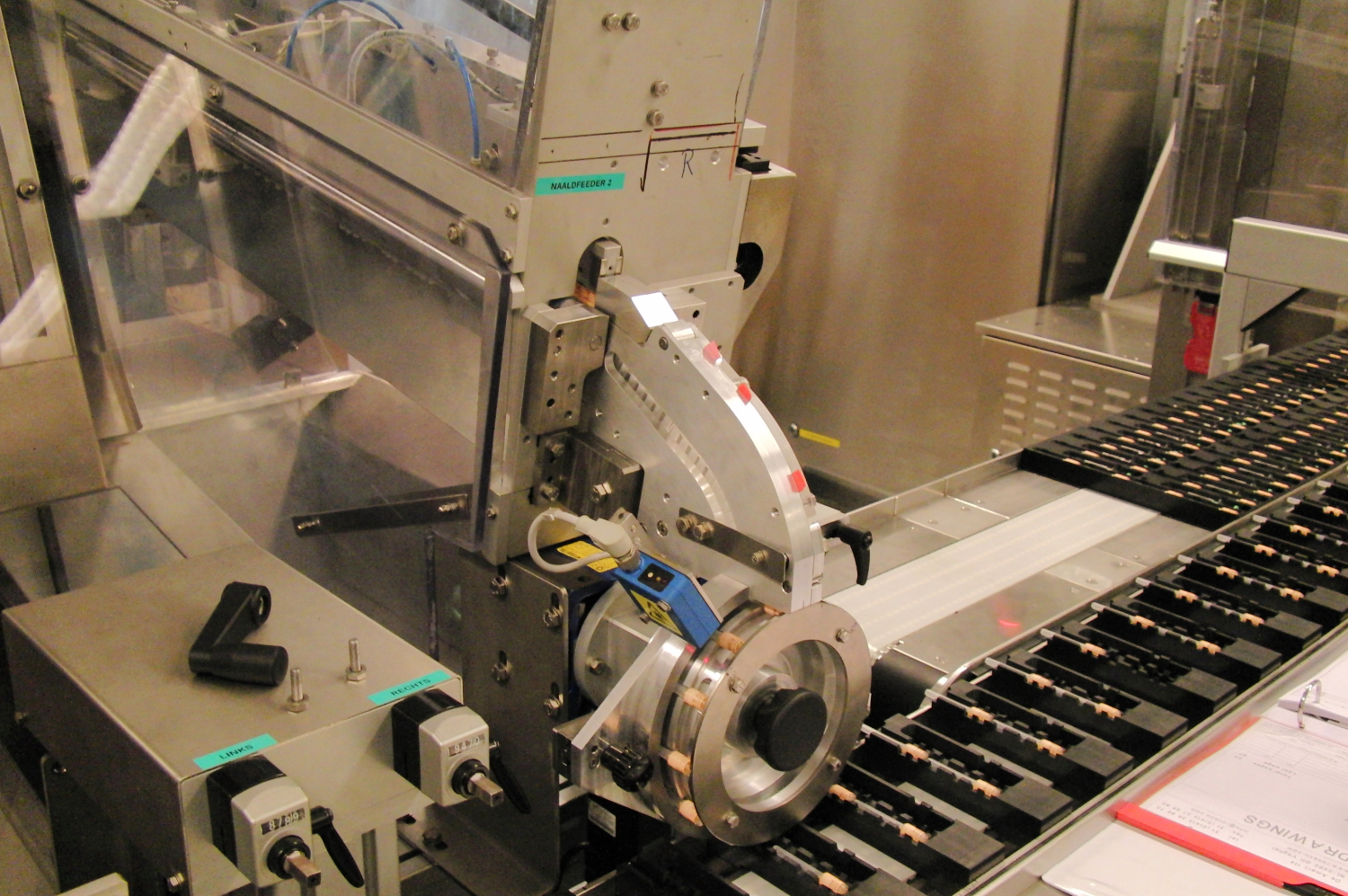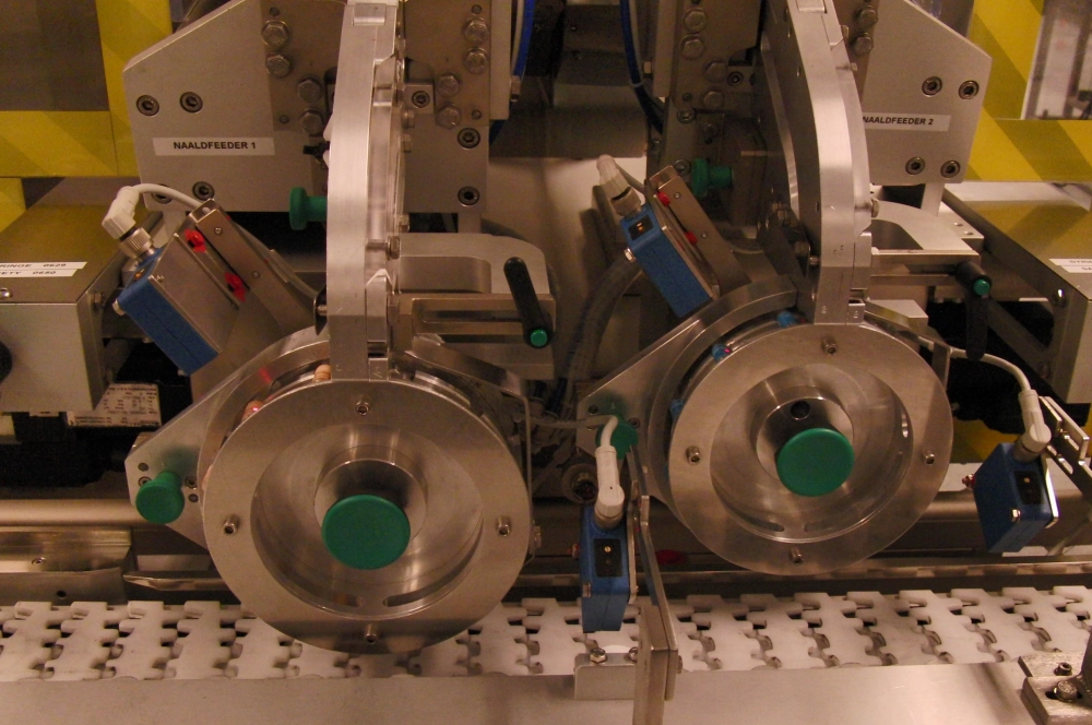A shipper case with needles can be emptied into the needle bunker. A Jacob's ladder transports the needles onto rotating shafts, which neatly line them up and guide them to the needle wheels. The needle wheels are equipped with servo motors that place the needles in the pocket of your machine at precisely the right moment. For this purpose, we equip your conveyor belt with holders, your blister machine, or any other machine with an encoder. Your machine can operate continuously (conveyor belt) or intermittently (blister machine). The needle position in your pocket can be adjusted laterally to the pocket's direction of movement. The complete needle feeder can be placed on a precision slide for this purpose. This GMP-compatible machine has an ergonomic design and is easy to clean.