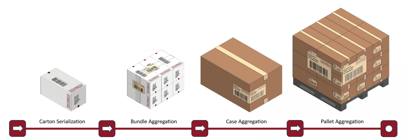 Aggregation in the pharmaceutical industry refers to the process of establishing a hierarchical relationship between uniquely serialized packaging levels. Each saleable unit (e.g., bottle or carton) is assigned a unique serial number. When multiple units are grouped into a larger container, such as a bundle, case, or pallet, that outer package also receives its own unique serial number.