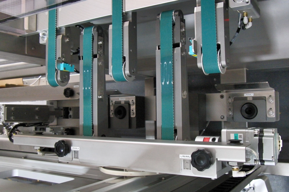 The tray unloader, also known as the component dispenser, is designed to empty trays containing tagserts, booklets, blisters, etc. The (pharma) code on both sides of the product is checked. An operator manually places full trays on the green belts. The component dispenser processes the trays and presents the products while verifying the (pharma) code on both the top and bottom sides. Products without a code, or with an incorrect (pharma) code, are rejected. The component dispenser then places the products on a conveyor or directly into a carton, which is encoder-linked to the stacker for perfect synchronization. Empty trays are automatically deposited into a kit bin.