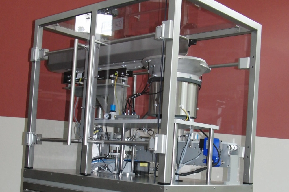 Deze machine is speciaal ontworpen voor het monteren van pluggen op spuiten. De achterstopper voorkomt dat de zuiger uit de spuit wordt getrokken tijdens het terugtrekken bij een injectie.
